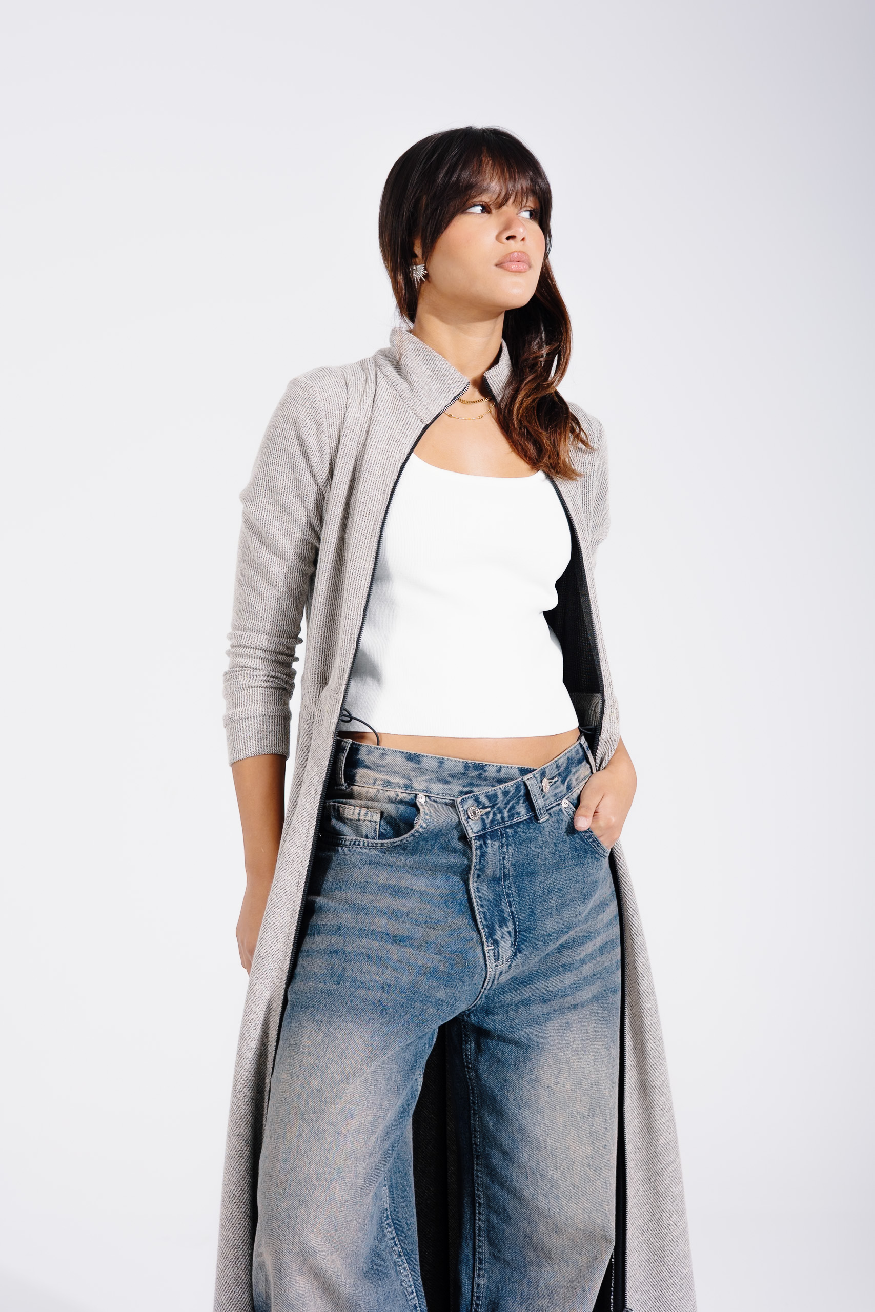 - Closure: Long zipper